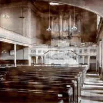 The interior has been extended and altered through the years. In 1847 the church was extended southwards, and the choir/organ area created above the vestry. The whole interior was dramatically remodelled in 1883. The present pulpit and communion area dates mostly from 1894 although the communion rail may be rather older than that. During and after the First World War the interior was altered again, the roof was renewed, and the present arched ceiling added. This ceiling closely resembles early Cinema design and may have been intended to make the interior look more 'up to date'. The Gallery tip-up seats were also a feature more at home at a cinema. Each seat incorporates a wire hat rack, so your bowler or top hat could be safely stowed under your seat. The pews downstairs were installed in the late 19th century, replacing the previous box pews. The new pews were numbered, so they could be rented to particular individuals at that time. There are also fold-down bench seats fixed to the walls to provide extra seating when required.